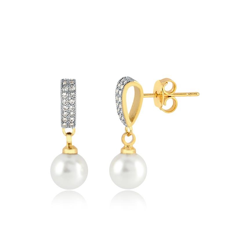 1 Brinco De Zircônias Cristal Com Pérola Shell 7mm Folheado A Ouro