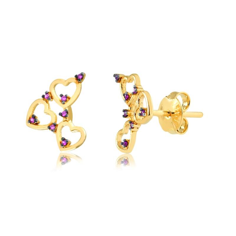 1 Brinco Três Corações Com Pedra Rose Folheado A Ouro